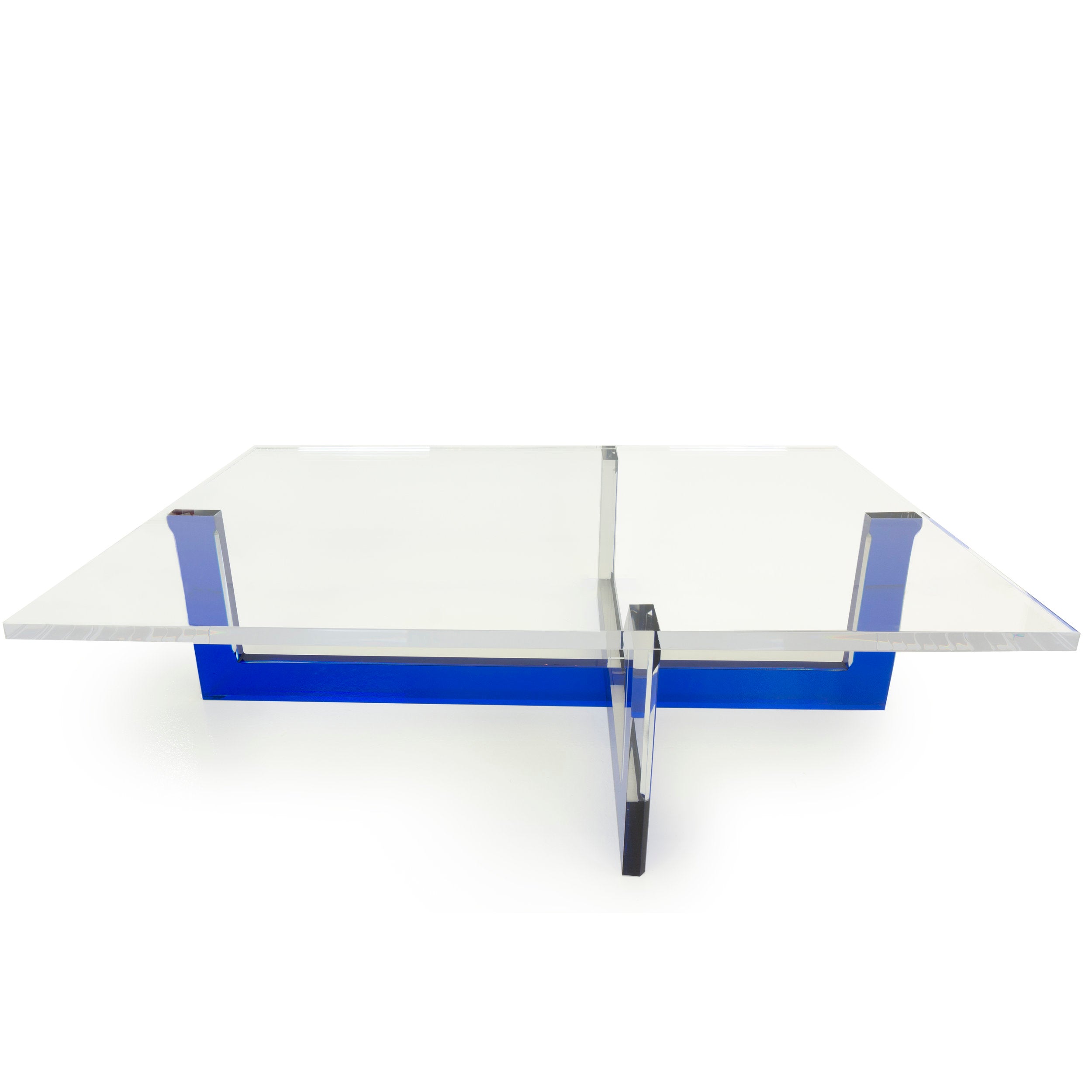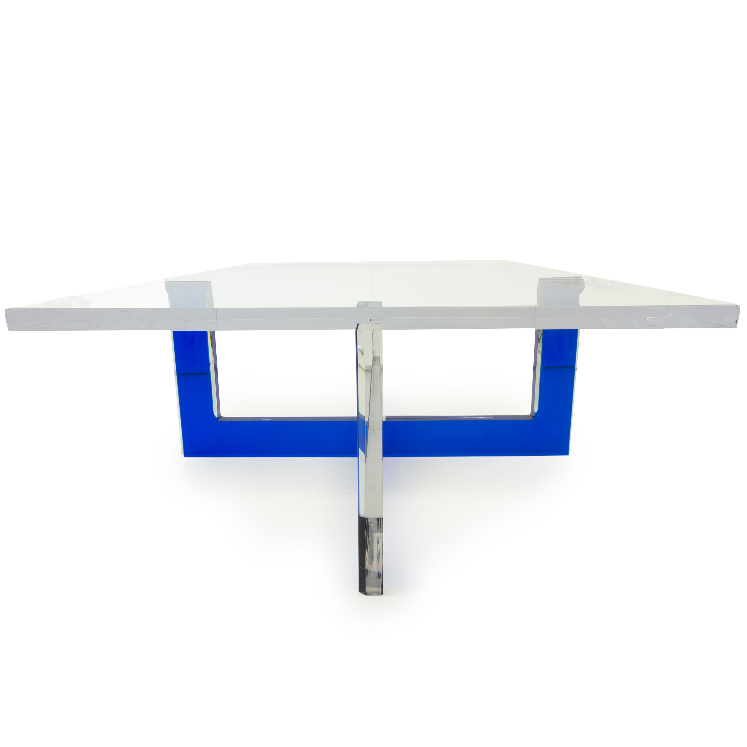The Architect Coffee Table is an instant centerpiece for your living space. It combines the reassuring strength of four sturdy, interlocking legs with the intriguing look of cantilevered surfaces, all presented for enjoyment beneath a see-through surface. Made with heavy furniture grade lucite.