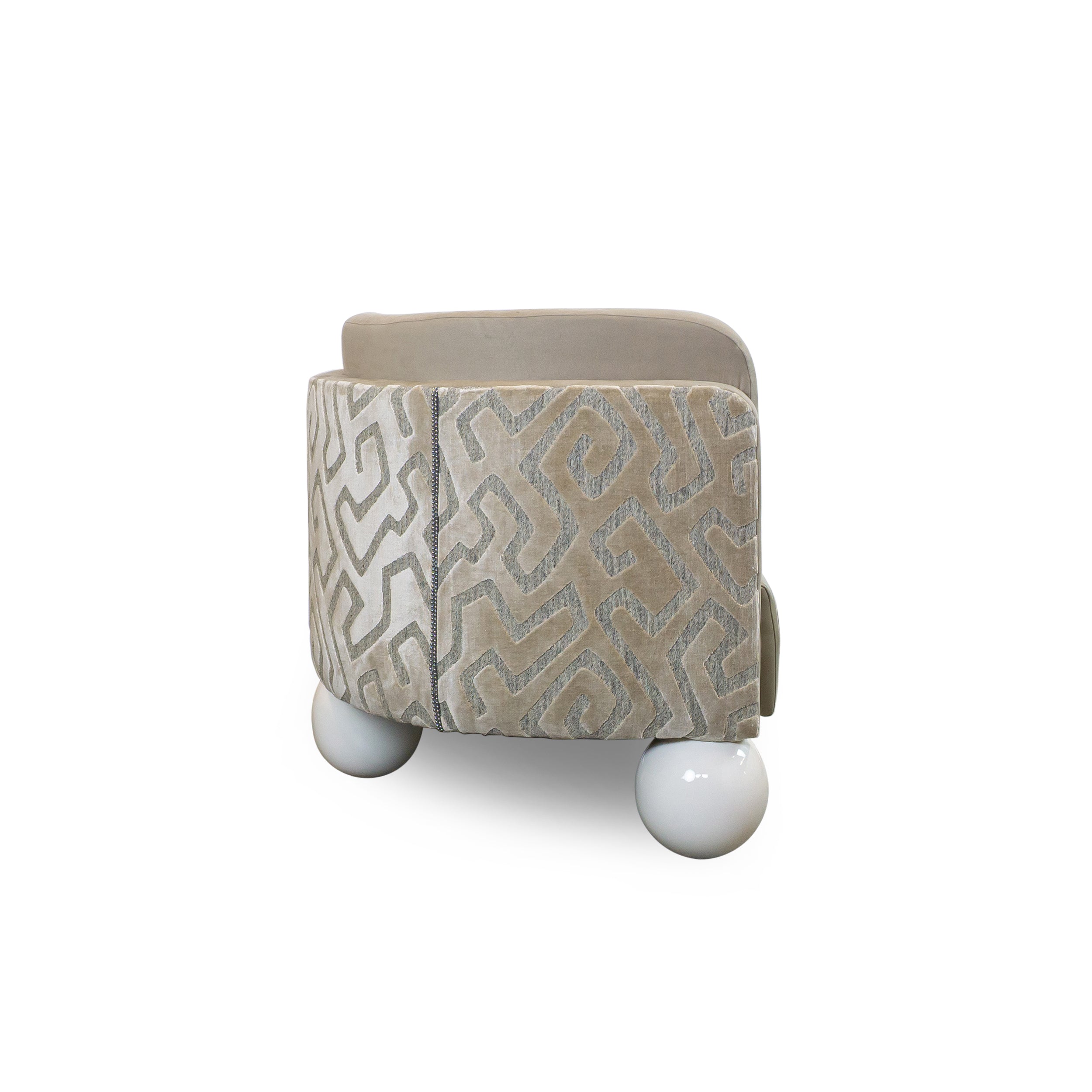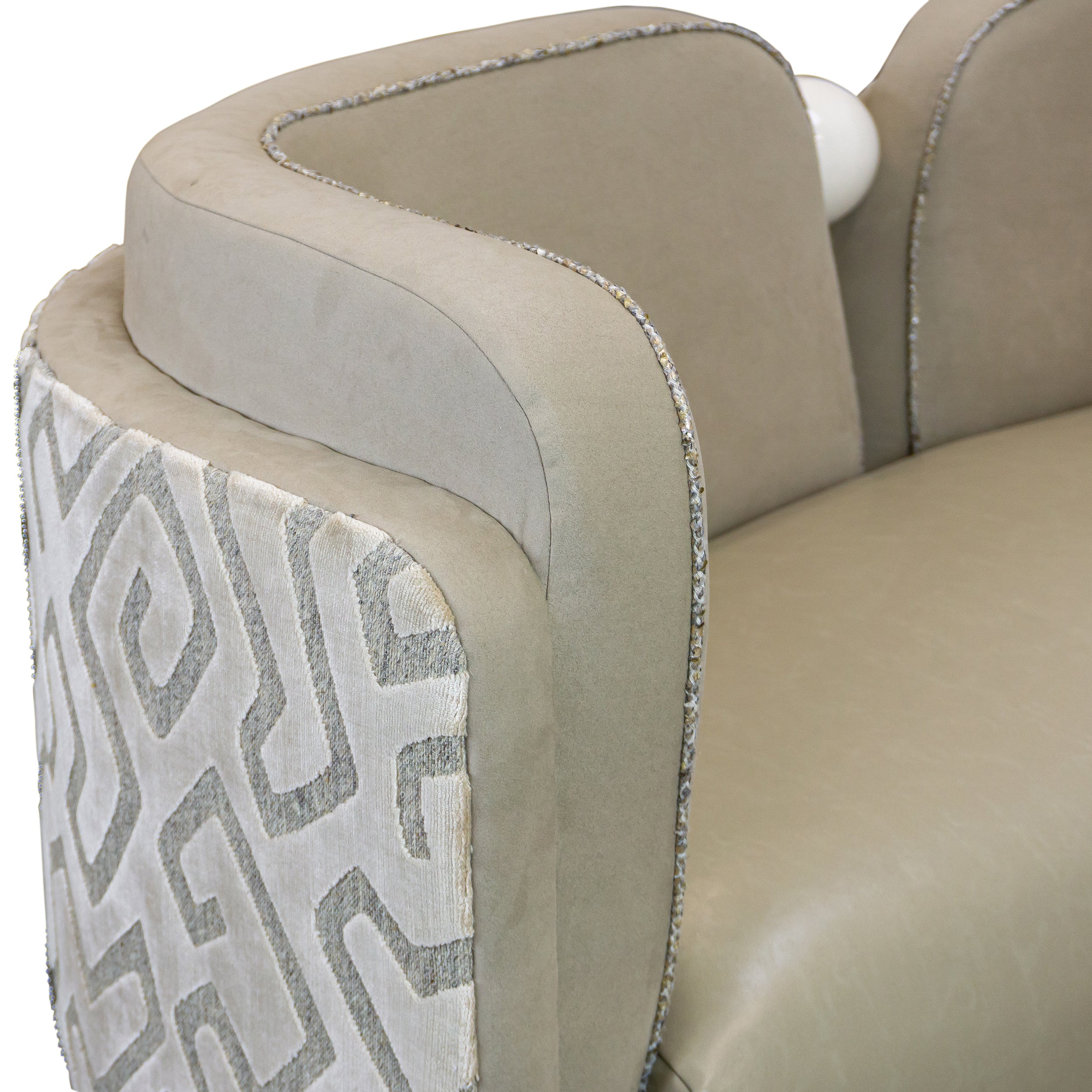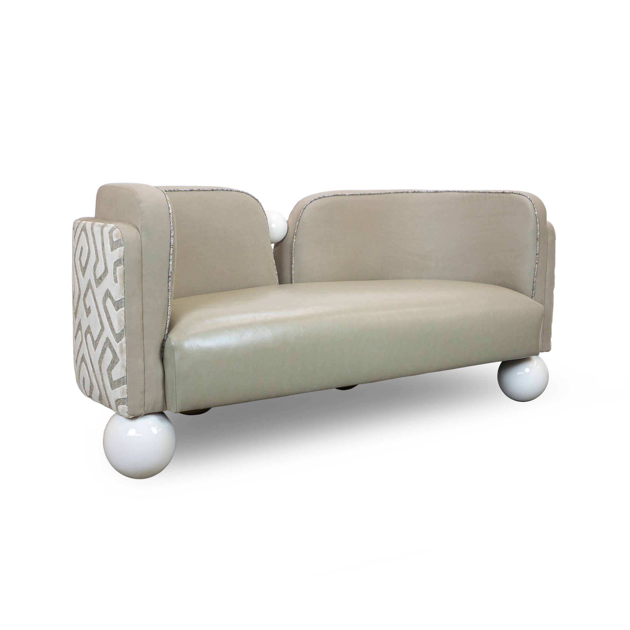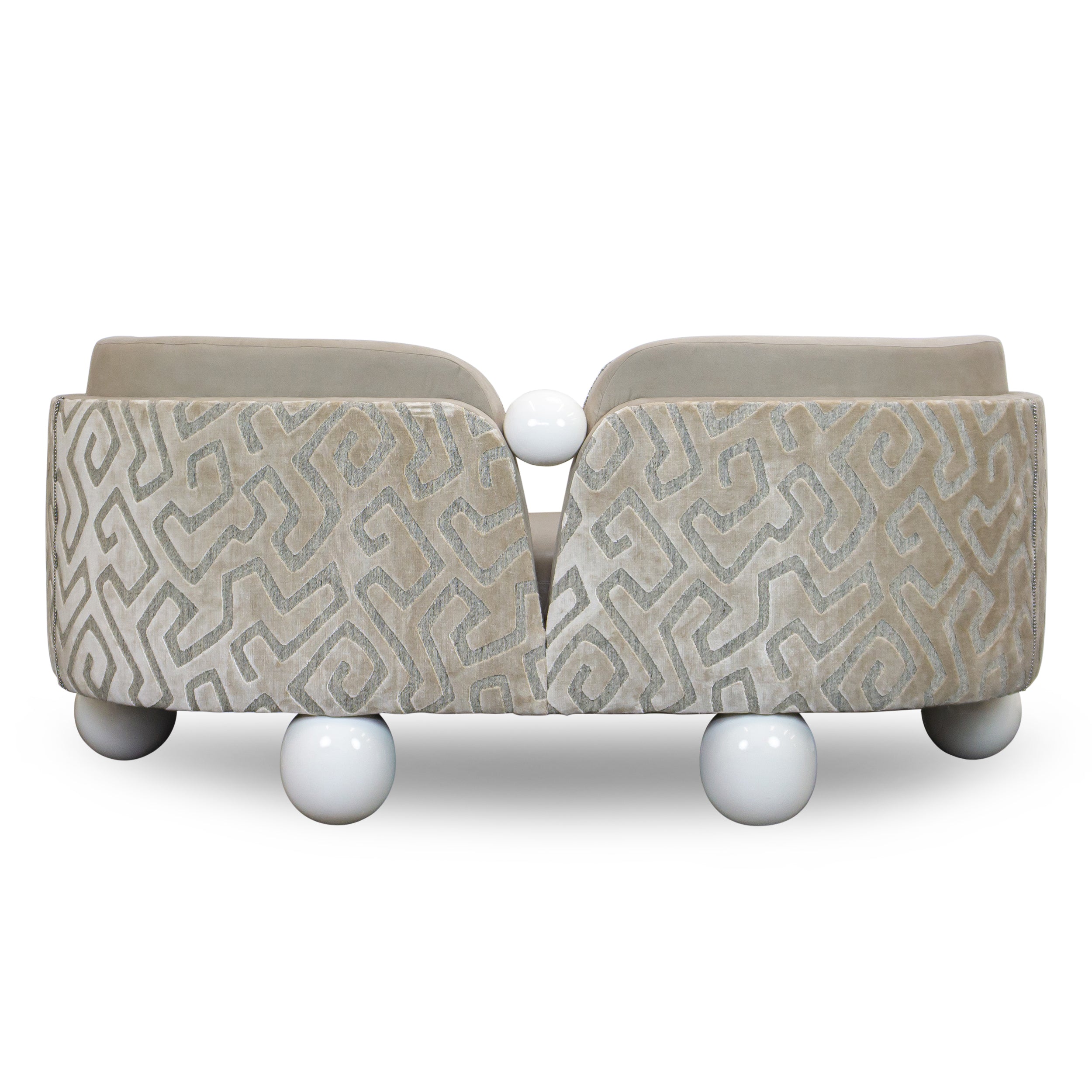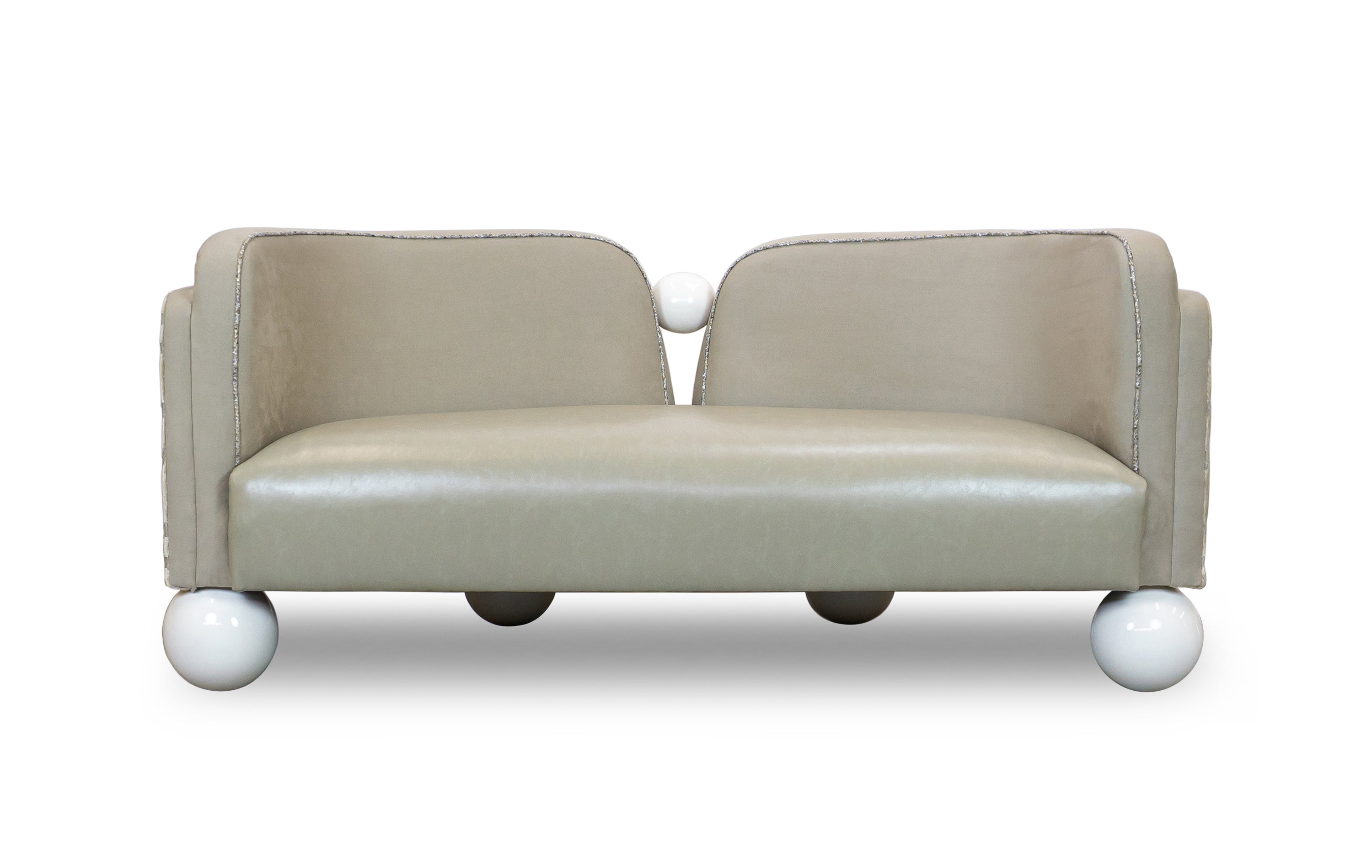 Striking but still practical, the Pearl Banquette is designed for rooms in which the back of the sofa faces the entrance. Its ball feet, split back, and graceful curves are a delight from all angles.
