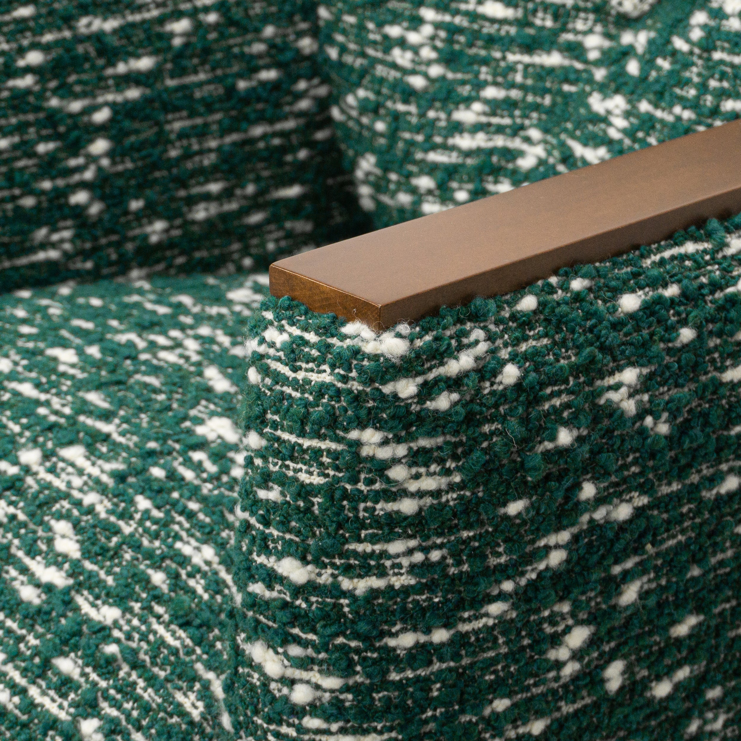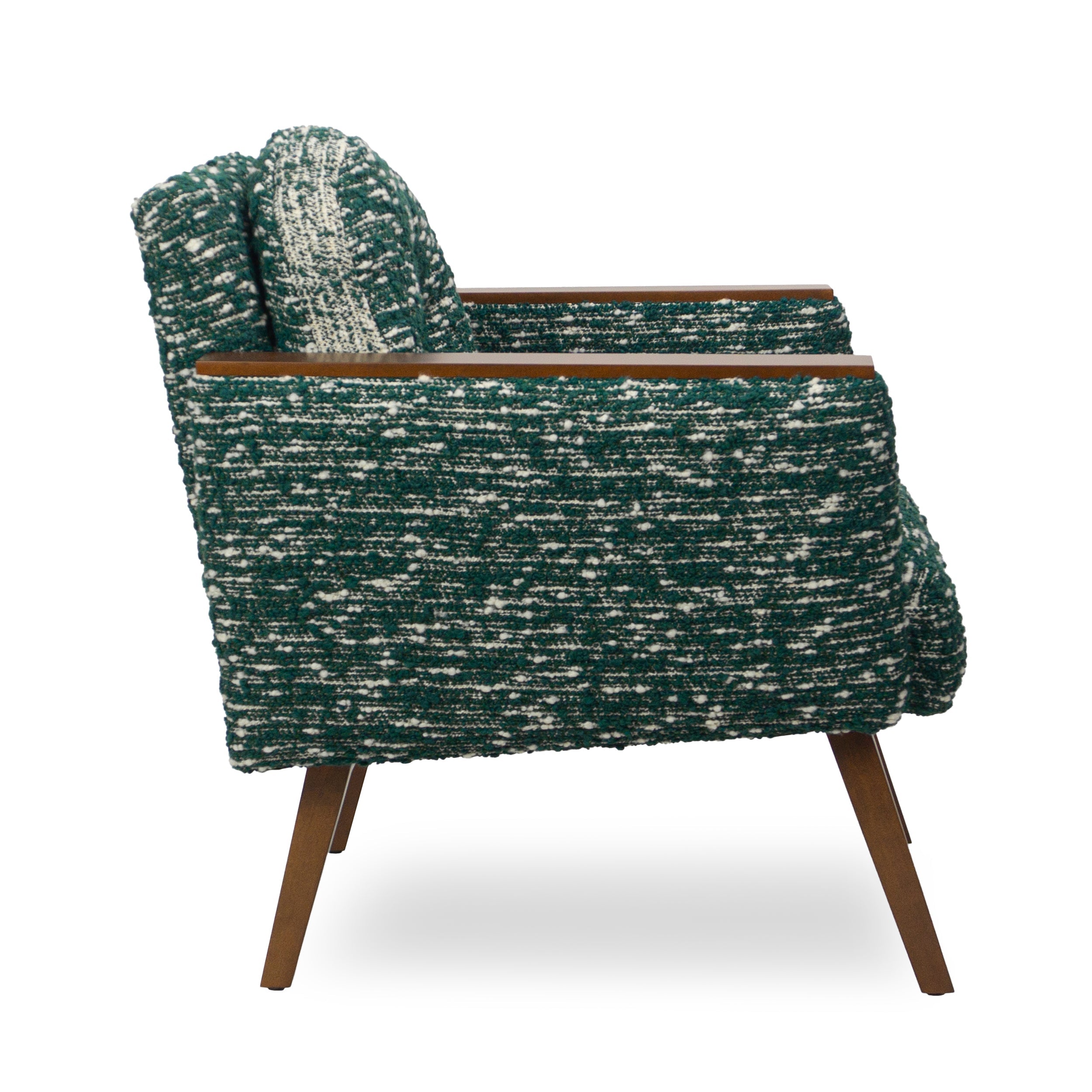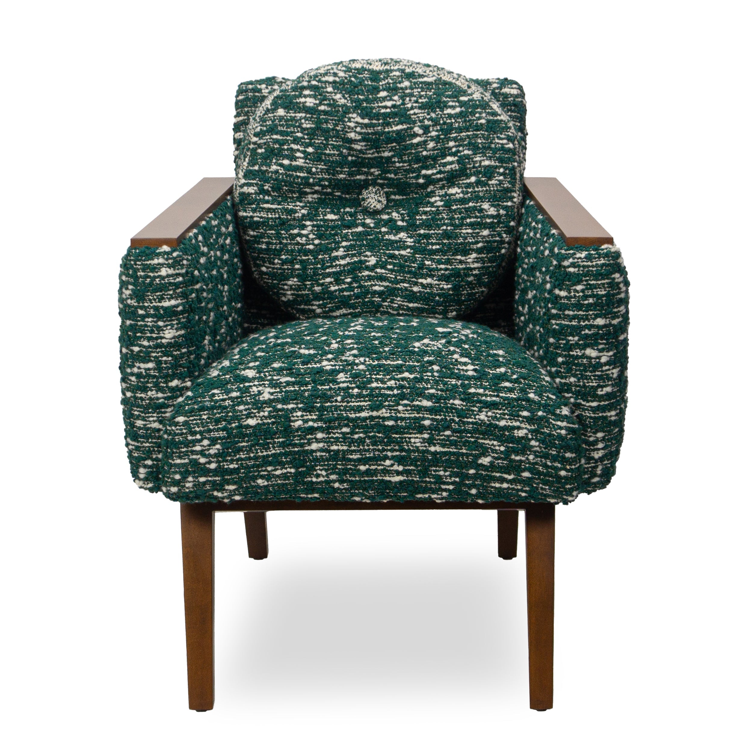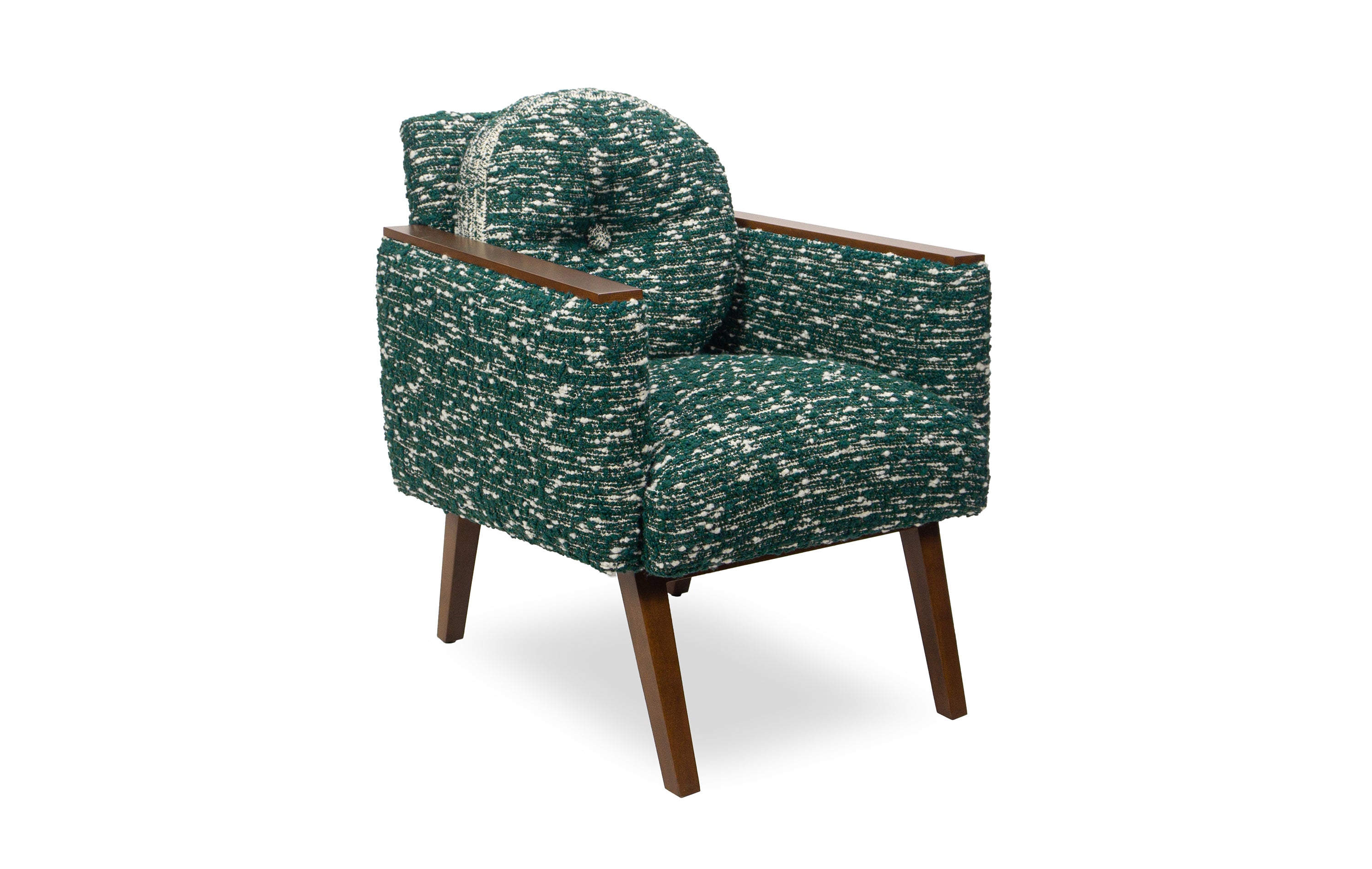Accent a living space or bedroom with the retro vibes of the Andre Chair. This compact piece features details that draw upon vintage designs, including wood arm rests and an attached round back cushion.